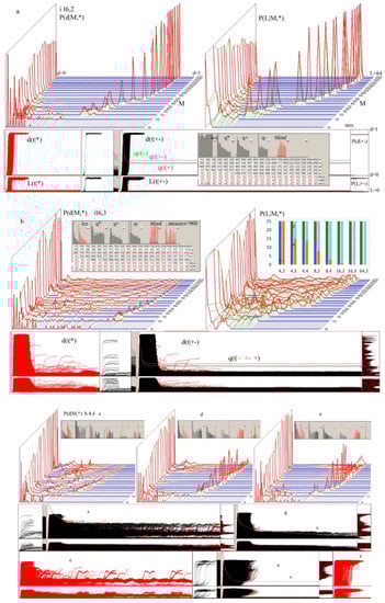 Distributions P(d|M,+−*) and P(L|M,+−*) were collected as a screen dump (see Figure 9) and files of data for Excel, but summarizing such independent network evolutions gives inadequate results, which blurs important elements, e.g., the effects of growing modules. All types of initiations (+,−,*) lead to very similar views, then in Figure 9 for P(d|M) and P(L|M), only ‘*’ is used, but P(d|M) and P(L|M) differ slightly—more interesting details can be seen in P(d|M) (see Figure 9b).