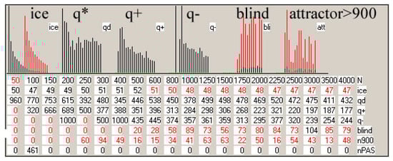 The structural tendencies are statistical effects in the structure of complex processes, especially of living entities, resulting from the condition of elimination. They correspond to old, challenged regularities of ontogeny evolution. Tendencies have already been defined and described in [19,20,23], where it is the difference between a given random distribution and the distribution modified by the adaptation condition. Here, the equivalent of the condition of adaptation is a weaker acceptance condition based only on not exceeding the threshold of great change, but the modifying factor is the condition of accumulation, slightly stronger than acceptance (attractors larger than 6 to increase the strength of persuading the obtained results), because it maintains the particular, studied specificity of the system state called half-chaos (although acceptance is enough). In general, any statistical differences in nodal properties resulting from the evolution that maintains half-chaos (controlled by a small change) are tendencies. For example, the tendencies are the persistence of half-chaos and the persistence of a high level of ice after the start from the point attractor, which disappear immediately after allowing the accumulation of random changes.