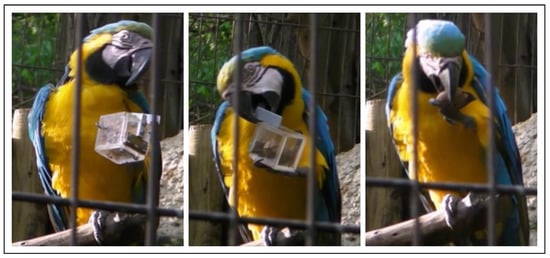 A blue-and-yellow macaw (Ara ararauna) opening a box to retrieve a food reward (i.e., a nut) using its left foot and its mouth (at the Ménagerie du Jardin des Plantes, MNHN, Paris). See Brunon et al. [] for a description of the manipulative repertoire of blue and yellow macaws. Photograph credit: Emmanuelle Pouydebat.