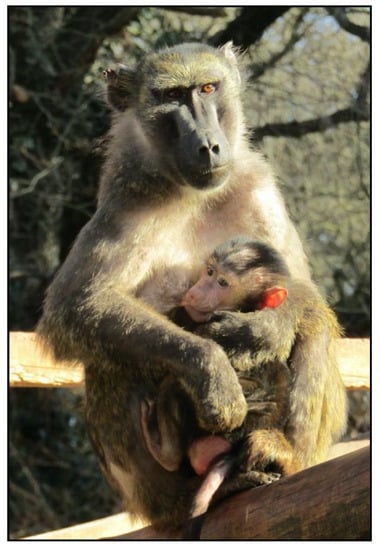 Furthermore, in human mothers, affective symptoms such as stress, depression, and anxiety can alter left cradling, reflecting a reduced ability to be emotionally involved with the infant [,,,]. A recent study investigated the link between left-cradling bias and the maternal emotional state in a non-human primate, the olive baboon []. The authors found the maternal cradling bias to shift toward a right bias in mothers living in high density groups with higher social pressure, likely involving higher levels of stress for the mothers (e.g., by increased frequency of conflicts and severe aggression). The socially related stress would alter the rightward hemispheric resources allocated to the maternal monitoring and ultimately affect the left-cradling bias []. Those results clearly illustrate the phylogenetic continuity between humans and catarrhine monkeys concerning this lateralization and its potential links with hemispheric specialization for emotions, inherited from a common ancestor 25–35 million years ago.