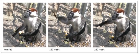 As a matter of fact, brachio-manual communicative gestures are found both in human and non-human primates, in which communication relies strongly on the visual sensory channel [,,,,,,,,]. The question of whether the gestures of humans and other primates (particularly great apes) are homologous has long been a debate, which has been limited by the heterogeneity of studies’ focuses depending on the species (see for reviews [,,]). However, in addition to recent results showing that human infants share the most part of their gestural repertoire with chimpanzees [], the fact that the functional definitions of primate gestures have been built based on developmental psychology studies [] allows us to make relative comparisons. The formal gesture definitions used in primate studies may vary from one study to another (see for review [,,,], yet the communicative nature of these movements is the core elements which functionally differentiate them from other actions. In that respect, the terms “manual gestures” refer to brachio-manual movements which (i) are directed to a recipient; (ii) receive a voluntary response, i.e., induce a change in the recipient’s behavior without acting as a direct physical agent, and thus (iii) are mechanically ineffective. Intraspecific manual gestures which fulfill these criteria have long been thought to be unique to humans and great apes [,,], but in the last years so-defined gestures have been reported in the spontaneous communication of other catarrhine primates (e.g., in olive baboons [,,]; bonnet macaques, Macaca radiata []; red-capped mangabeys, Cercocebus torquatus [,,]). To our knowledge, no such forelimb gestures (i.e., apparently intentional) have yet been demonstrated outside the primate lineage, hence the following discussion will focus on this clade.