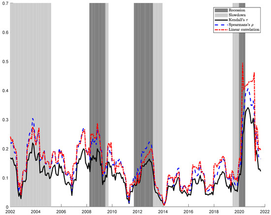 Average Linear correlation, Spearman’s , and Kendall’s , computed using a rolling window of one year. Recessions and slowdown periods are from Eurostat’s Business Cycle Clock (BCC).