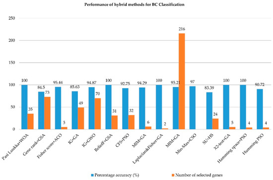 Shreem et al. (2016) [55] proposed a hybrid (filter-wrapper) FS method using symmetrical uncertainty (SU) with HS (SUHS algorithm). This method consisted of two steps. In the first step, the SU filtered out the redundant and irrelevant features in the BC data. Every gene was allocated a score to represent the correlation of genes according to the class. The genes were ranked from the highest to lowest in the next step. Next, the wrapper method was used, which combines the HSA with two different classifiers (IB1 and NB). The experiment was repeated 10 times using the BC dataset. The results showed that the combination of the SUHS algorithm with the IB1 classifier presented more than 80% classification accuracy compared to the NB classifier. The proposed method selected fewer than 30 genes for BC. Shreem et al. (2016) also tested their proposed method for other types of cancer datasets (leukemia, colon cancer, lymphoma, ovarian cancer, and SRBCT). The results showed that the proposed method outperformed other existing methods with a minimum number of selected genes.