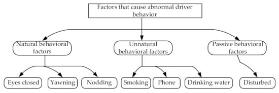 - We established an abnormal behavior analysis library, in which natural behavioral factors include: (1) eyes closed, (2) yawning, and (3) nodding; unnatural behavioral factors include: (1) smoking, (2) phone, and (3) drinking water; and passive behavioral factors include disturbance. The abnormal behavior library provides the basis for the construction of a driver abnormal behavior recognition model.