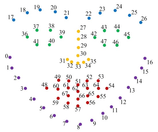 There were five key points for unilateral eyebrows, which were uniformly sampled from the right to the left, for a total of 5 × 2 = 10 key points. The eyes were divided into six key points, and the upper and lower eyelids were uniformly sampled from the right to the left boundary, for a total of 6 × 2 = 12 key points. The lips were divided into 20 key points, except for the two corners of the mouth, which were divided into the upper and lower lips, the outer boundary of the upper and lower lips, each of which was uniformly sampled by five key points, and the inner boundary of the upper and lower lips, each of which was uniformly sampled by three key points, so a total of 20 key points. The nose included four key points of the bridge of the nose and five points evenly collected from the tip of the nose, for a total of nine key points. The face contours were uniformly sampled with 17 key points.