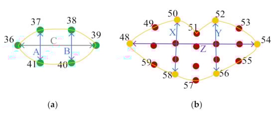 where , , and , as shown in Figure 5a, the coordinates , , , , , and are the coordinates of the six key points of the right eye.