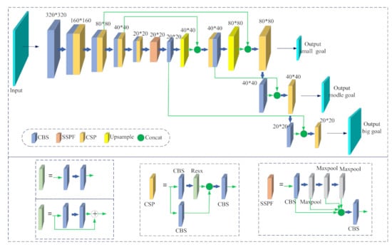 Figure 7 shows the YOLOv5 network structure diagram. The input is an RGB image, and the output is three tensors representing three different scale bounding boxes. The parameter information contained in each tensor produces the classification result of object detection. The network model defaults to the 640 × 640 image input, and multiple combined CBS+CSP operations are designed in the network to extract deeper feature maps, in which the CBS consists of a convolution operation (Conv), batch normalization (BN) layer, and SiLU activation function [42]. Deeper feature maps have stronger semantic features and weaker location information, while shallower feature maps have stronger location information and weaker semantic features. Correspondingly, these two types of features can undergo information transfer and fusion to obtain feature maps that capture more complex feature information.