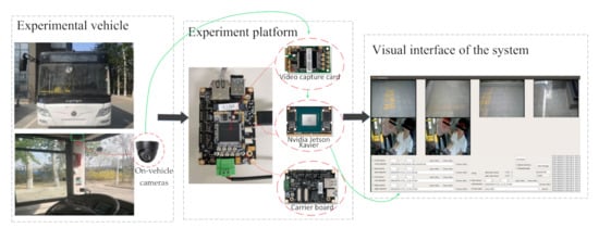 The process of driver abnormal behavior recognition is represented by the green line in Figure 8, in which the video capture card of the experiment platform is connected with the on-vehicle cameras on the experimental vehicle through wiring, the real-time monitoring data in the cab can be collected, and the data can be collected through the serial input to the Nvidia Jetson Xavier (NX) module. The NX module transmits the image of the video stream data into the deployed abnormal behavior recognition model. If there is an abnormal driver behavior, the visual interface of the system displays a picture of the moment when the behavior occurs and outputs the alarm information.