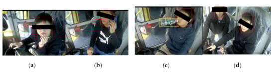 The dataset for the YOLOv5 model was made locally by us. The goal of the dataset was to simulate specific abnormal behaviors, collect multiple videos, cut and frame these videos, convert the videos into sample images, and then classify and annotate the sample images. The resulting labeled samples were used as a dataset of abnormal bus driver behavior. Figure 9 shows examples of the labeled images for various types of abnormal driver behaviors represented in the dataset. Among them, 7965 images were used as the training set, and 2433 images were used as the test set.