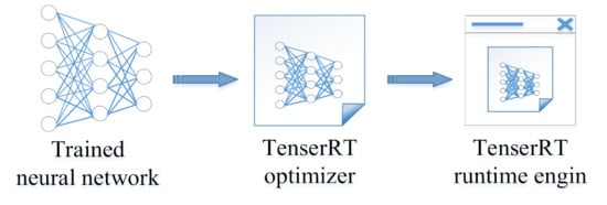 TensorRT is a deep learning inference computing framework that optimizes the use of GPU resources [52]. TensorRT can be divided into two phases: the build phase and the compile phase. In the build phase, TensorRT receives externally provided network structure weights and hyperparameters, optimizes the network compiled on the NX, and generates an inference engine. In the compile phase, the GPU computing resources are called by running the inference engine, and the process is shown in Figure 10.