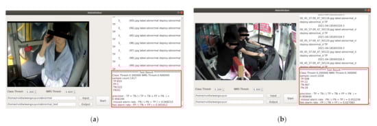 This experiment verified the performance of the model on the NX side by randomly selecting the data in the local scene many times. Figure 11 shows the PR, MR, and FR of the NX side model. Among them, (a) randomly selecting the detection results of 1417 local image data, PR = 95.6%, MR = 6.8%, FR = 0.2%; (b) randomly selecting the detection results of 1016 local image data, PR = 95.9%, MR = 5.2%, FR = 2.7%. After multiple verifications, the PR was above 95%.