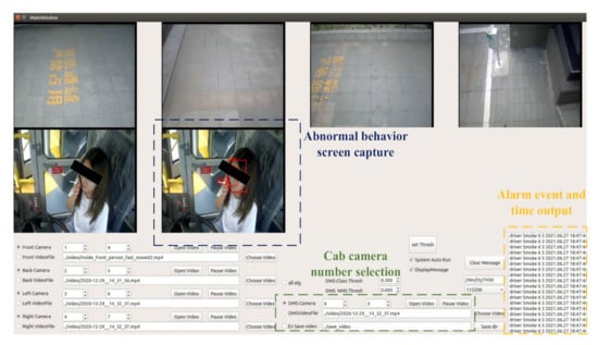 We developed an interface display for the identification of abnormal driver behavior in the form of an external window. Figure 12 shows the visual interface of the system operation. The visual interface can output multichannel camera images, display the captured video frames of abnormal driver behavior, and output alarm information in real-time.