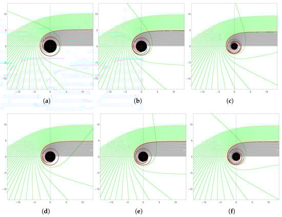 Using Equation (7), we are able to obtain light trajectory graphs with different values of and , as shown in Figure 2. In Figure 2, the black hole is represented as a black disk and the dashed line around the black hole represents the radius of photon ring; which is simply the two-dimensional expression of the photon sphere. When , corresponding to the black line in the figure, this means that all of the light falls into the black hole. When , corresponding to the red line, this means that the light rotates around the black hole and is neither captured nor is able to escape, forming a photon ring. When , corresponding to the green line, this means that the light is deflected as it approaches the black hole. In addition, we can intuitively see from Figure 2 that the size of the black hole changes more obviously as changes, and more or less unchanged with changing .