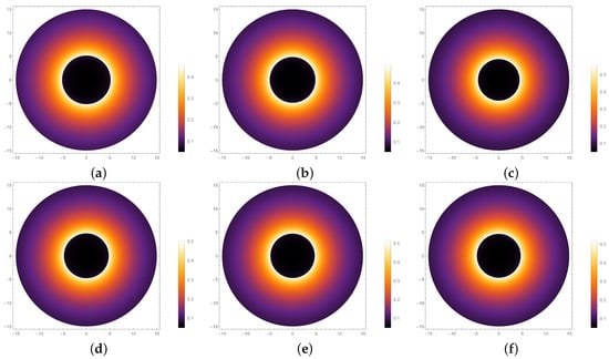 In Figure 3, when , because the light intensity is mostly absorbed by the black hole, the intensity of light captured by the observer is minimal, although the specific intensity does not go to zero because a small amount of radiation escapes from the black hole, thereby presenting a small finite intensity. When , it means that at this point the light is in a critical state and rotates around the black hole repeatedly to obtain arbitrary intensity values; consequently, the specific intensity has a maximum in this case. When , the light encounters a barrier and is refracted to the distant observer. The light intensity captured by the observer at this time is mainly the refracted light. In subfigure (a) of Figure 3, it can be seen that larger values of result in higher peak values, meaning that the corresponding b is lower. In Figure 3b, we find that the curve changes less with changes of the parameter, which is another way of saying that the relationship between the specific intensity and the impact parameter b is almost unaffected by changing . The corresponding observational shadow features of an RGI black hole as seen by an observer at a distance under different parameters are presented in Figure 4.
