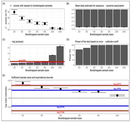 Results from simulated example. (A) Illustration of -scores for different bootstrapped sample sizes and their eventual convergence, (B) Mean estimates and standard errors of the exposure–outcome association, (C) Negative log (base = e) p-values as bootstrapped sample sizes increased, (D) Power of the likelihood ratio test based on the calibrated cutoff value , and (E) Sufficient sample sizes concerning the choices of equivalence bounds.
