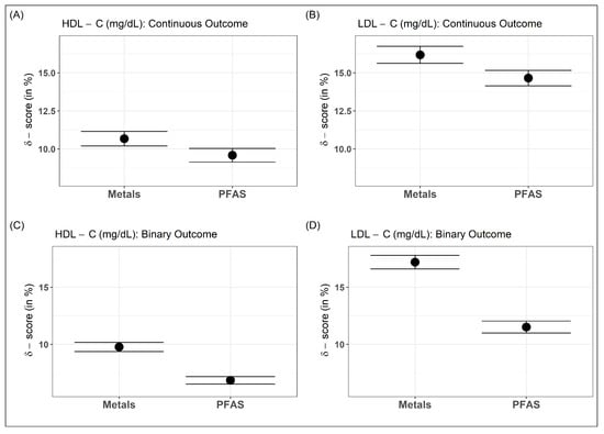 For metals and PFAS, the -scores of continuous HDL-C were CI: and CI: , respectively, whereas for continuous LDL-C, the scores were CI: and CI: , respectively. Both mixtures had relatively higher -scores on LDL-C than HDL-C. Furthermore, for both cholesterols, the metal mixture had a slightly higher -score than the PFAS mixture (Figure 2A,B). PFAS and Metal mixtures have higher -scores for LDL-C than HDL-C. Further, after dichotomizing the cholesterols at their 90th percentile, the -scores for the metal mixture remained similar to the continuous cholesterol outcome (HDL-C: CI: and LDL-C: CI: ), but decreased slightly for the PFAS mixture (HDL-C: CI: and LDL-C: CI: ). The decrease might have been due to some loss of information during dichotomizing the outcomes (Figure 2C,D).