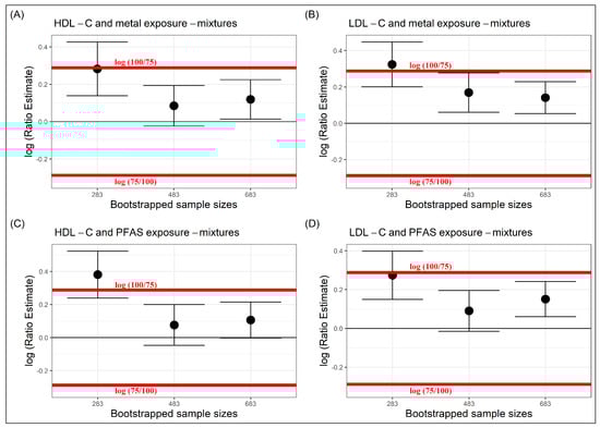 Sufficient sample sizes were also estimated for this dataset at the equivalence bounds of , . For both metal and PFAS mixtures, the and their corresponding CIs for bootstrap size 683, lay well within the equivalence bounds. Further, even at a decreased sample size of 483, the and their CIs, remained within the equivalence bounds. Therefore, is a sufficient sample size at equivalence bounds , for both metal and PFAS mixtures (Figure 3), but a further decrease in the bootstrap size, would not be sufficient at this pre-fixed equivalence bounds. One can further modify the bootstrap size to obtain a precise estimate of sufficient sample size.