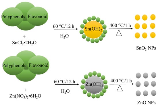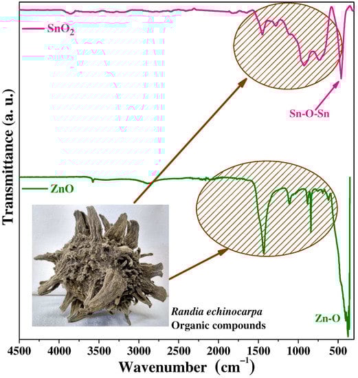 Several reports have been published regarding the green synthesis of SnO2 and ZnO; for example, Jadhav et al. demonstrate green synthesis of SnO2 with the aid of Carica papaya leaves, showing control over nanoparticle size which results in a size of ~7.1 nm []. Daphne mucronatahas has also been used as a reducing and stabilizing agent during the synthesis process of SnO2 nanoparticles [], and in the work of Najjarand and colleagues, chitosan was used at different synthesis temperatures to positively avoid agglomeration []. In the case of ZnO nanoparticles, there are also several reports; that of Sadiq et al. shows the use of Syzygium Cumini for the elimination of Methylene Blue []. Additionally, Selim et al. took advantage of the properties of Deverra tortuosa to obtain ZnO nanoparticles with cytotoxic properties []. Moreover, Pillai et al. attained ZnO nanoparticles with antimicrobial and fungicide properties using Beta vulgaris, Cinnamomum tamala, Cinnamomum verum, and Brassica oleracea var. Italica through green synthesis [].