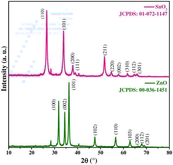 X-ray diffraction spectroscopy (XRD) was performed on samples of the synthesized materials to identify their crystallinity. The diffraction patterns of the SnO2 and ZnO nanoparticles are illustrated in Figure 2. In the SnO2 diffractogram, the diffraction peaks located at 2θ with values of 26.6°, 33.8°, 38.0°, 38.9°, 51.7°, 54.7°, 57.9°, 61.7°, 64.6°, and 65.8° are associated to the planes (110), (101), (200), (111), (211), (220), (002), (310), (112), and (301), respectively, which indicates the formation of SnO2 in a cassiterite phase with a tetragonal crystalline structure according to data reported in JCPDS #72-1147 []. The ZnO XRD pattern exhibited nine defined peaks at 2θ with values of 31.8°, 34.4°, 36.3°, 47.5°, 56.6°, 62.8°, 66.4°, 67.9°, and 69.0° which correspond to planes (100), (002), (101), (102), (110), (103), (200), (112), and (201), respectively. These diffraction peaks are indexed to the wurtzite phase and a hexagonal crystalline structure of zinc oxide according to JCPDS #36-1451 [,]. The well-defined and intense peaks in the diffraction patterns depict the high crystallinity of the SnO2 and ZnO nanoparticles []. Crystallite sizes of both as-synthesized materials were calculated by the Scherrer equation, which is defined as , where K is the dimensionless shape factor (0.9), λ is the wavelength of Cu Kα (1.54 Ǻ) X rays, β is the full width at half-maximum (FWHM) in radians, and θ is Bragg’s angle in radians []. The values of the most intense peaks, ascribed to the (110) and (101) planes of SnO2 and to (100) and (101) of the ZnO nanoparticles, were used for evaluating the crystalline structure factors and for resolving the crystallite sizes. The crystallite sizes were 14.18 and 21.89 nm for SnO2 and ZnO, respectively. These sizes have been reported elsewhere regarding both materials [,,].