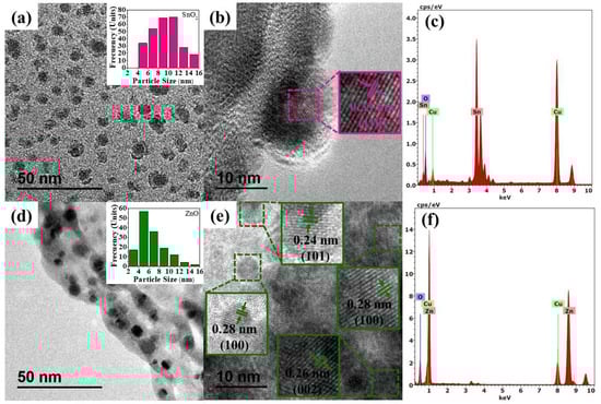 The as-synthesized nanoparticles were subjected to transmission electron microscopy (TEM) to ascertain their morphology and size. A TEM micrograph of the SnO2 nanoparticles can be seen in Figure 3a. Quasispherical nanoparticles of average size between 8 and 12 nm are observed, as is detailed in the histogram (3a inset), which matches the data reported in the literature []. In the HRTEM image (3b), the lattice fringe was measured to be 0.33 nm, which is ascribed to the main crystalline plane (110) of tetragonal SnO2; this proved to be the preferential growth direction []. The elemental analysis spectrum of the SnO2 nanoparticles acquired through energy-dispersive X-ray spectroscopy (XEDS) is shown in Figure 3c, which defines solely Sn and O as the main chemical components, indicating the obtainment of SnO2 nanoparticles. Meanwhile, the TEM micrograph in Figure 3d depicts distributed, quasispherical ZnO nanoparticles without any detectable agglomeration. The histogram of size distribution, garnered through the Image J software, is shown in Figure 3 (3d inset) and renders a narrow distribution of nanoparticle average size, 4–6 nm. The HRTEM image of ZnO is disclosed in Figure 3e, where lattice fringes of 0.28, 0.26, and 0.24 nm were identified, corresponding to the planes (100), (002), and (101), respectively. This reveals the preferential growth directions and the high-order arrangement of the ZnO nanoparticles. These results are congruent with those derived from XRD and those found in the literature [,]. Additionally, the XEDS spectrum only manifested peaks corresponding to Zn and O (Figure 3f), confirming the successful formation of ZnO nanoparticles.