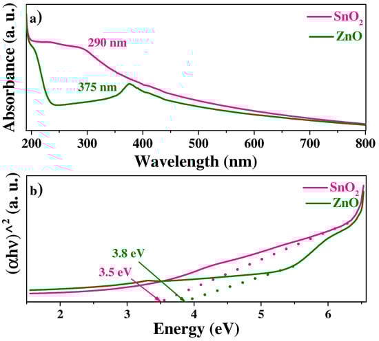 The optical properties of SnO2 and ZnO were analyzed through the UV–Vis spectroscopy technique, and the results are displayed in Figure 4. A band at 290 nm resulted from the analysis of SnO2, characteristic of SnO2 nanoparticles with a band gap of 3.5 eV. The ZnO sample portrayed a strong signal at 375 nm and a 3.8 eV band gap. The band-gap values of SnO2 and ZnO fall within the UV range, making it possible for them to be used in photocatalytic degradation []. It becomes evident that the acquired band-gap values for both materials rise over those reported for conventional nanoparticles [,]; this is because the Randia echinocarpa extracts act in a manner analogous to a stabilizing agent during nanoparticle synthesis, avoiding nanoparticle overgrowth [], which achieves quantic confinement due to the diminished size and, in turn, accomplishes an increase in band-gap value [].