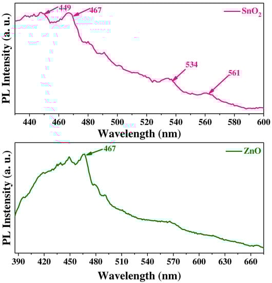 The optical analyses of the SnO2 and ZnO nanoparticles were supplemented with photoluminescence analyses (PL); the spectra are shown in Figure 5. Firstly, four important signals are disclosed in the SnO2 spectrum within the blue range at 449, 467, 534, and 561 nm [,]; the bands are attributed to luminescent centers such as structural defects and other defects generated by the presence of organic molecules from the Randia echinocarpa extracts [], verifying their presence as was resolved by FT-IR. The ZnO spectrum denotes a strong emission between 385 and 534 nm with a maximum peak at 467 nm, attributable to a high density of surface defect states within the band gap which lead to a strong band flexion and a significant reduction in the rate of exciton recombinations [,]. The density of states is caused by defects such as oxygen vacancies and interstitial Zn defects existent in ZnO nanoparticles; these defects can be a consequence of organic molecules from Randia echinocarpa, which indicates their continuance after the synthesis process, as was observed by the FT-IR assay [,].