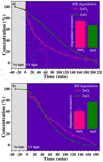 The photocatalytic properties of SnO2 and ZnO were evaluated through the photocatalytic degradation of the cationic dyes MB and RB in UV radiation. The MB degradation is disclosed in Figure 7a; SnO2 and ZnO achieved a 5 and 4% dye concentration decrease, respectively, within the first 30 min of reaction in darkness. This decrease is an effect of the dye’s adsorption onto the nanoparticle surface, owing to the affinity between them [,]. Once the lamp was lit, SnO2 degraded 95% after 210 min of reaction time, whereas ZnO achieved 100% degradation. It was faster with SnO2 within the first minutes than with ZnO, as is shown by the rate constants in the inset of Figure 7a with values of 0.01421 and 0.01201 min−1 for SnO2 and ZnO, respectively. Similar to the case of MB, since both are cationic dyes, the underlying affinity of RB towards the nanoparticle surface induces a reduction of solution concentration by 2% with SnO2 and ZnO after 30 min in the dark (Figure 7b). Moreover, ZnO achieved the highest efficiency of 100% RB degradation in 150 min, while SnO2 did so in 180 min. Likewise, ZnO had a degradation rate constant of 0.02191 min−1, higher than that of SnO2, equivalent to 0.01437 min−1. The as-synthesized nanoparticles accomplished good photocatalytic activity towards the degradation of dyes MB and RB, where ZnO revealed the best results. Another more-favorable characteristic of ZnO over SnO2 was the smaller nanoparticle size obtained (8–12 nm for SnO2 and 4–6 nm for ZnO), which brings about a larger surface area that, in turn, translates into a larger quantity of active sites over which photodegradation can develop, improving pollutant-dye elimination [,,]. Table 1 shows the degradation results of organic pollutants (MB and RB) from some investigations.