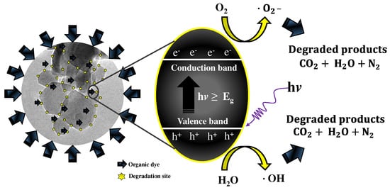 The photocatalytic degradation mechanisms of both dyes, MB and RB, unfold in a very similar way with SnO2 and ZnO, and the proposal of this work to define it is schematically is shown in Figure 8. The photocatalysis reaction of the organic dyes happens in a homogenous way; this implies that the dye molecules remain adsorbed on the surface of the SnO2 and ZnO nanoparticles (active sites). When UV light is irradiated over the system and its photon energy is greater than the nanoparticle band-gap values (hv ≥ Eg), 3.5 and 3.8 eV for SnO2 and ZnO, respectively, electrons (e−) are generated in the conduction band and holes (h+) in the valence band []. The excited e− react with oxygen molecules, forming superoxide anion radicals (•O2−), and the h+ interact with water molecules from the system giving rise to hydroxyl radicals (•OH) []. •O2− and •OH are highly powerful oxidating agents with extremely high reactivity, responsible for decomposing the organic dye molecules into depleted, benign subproducts such as CO2, H2O, and ion salts [].