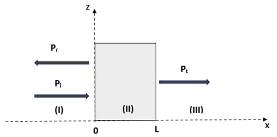 To simplify the analysis, as previously achieved, we use the Laplace transform, which is more adequate for our problem. We note that, following the definition in (15), is the Laplace transform of . The pressure fields on both sides of the medium in the Laplace domain are given by the following: