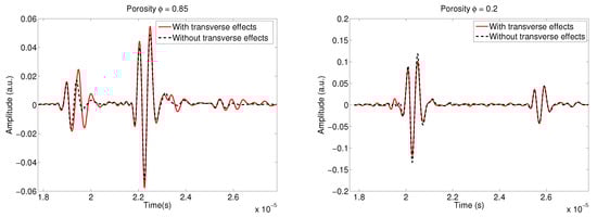 Comparison between simulated transmitted signals by considering or not considering the transverse effects for two values of the porosity: and .
