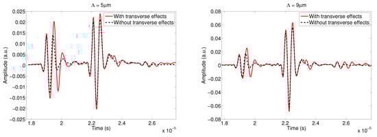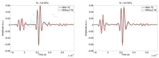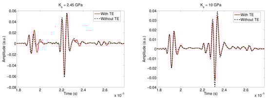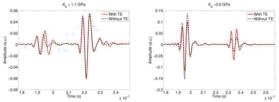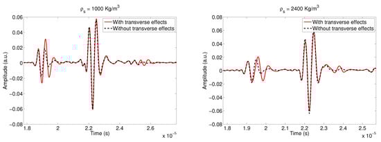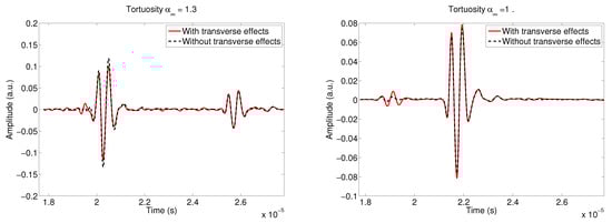 Figure 3 represents a comparison of the simulated transmitted signals when only the effect of longitudinal waves is considered (black dotted line) and when the effect of the transverse waves is combined with that of the longitudinal waves (red line) for two different values of the tortuosity and .