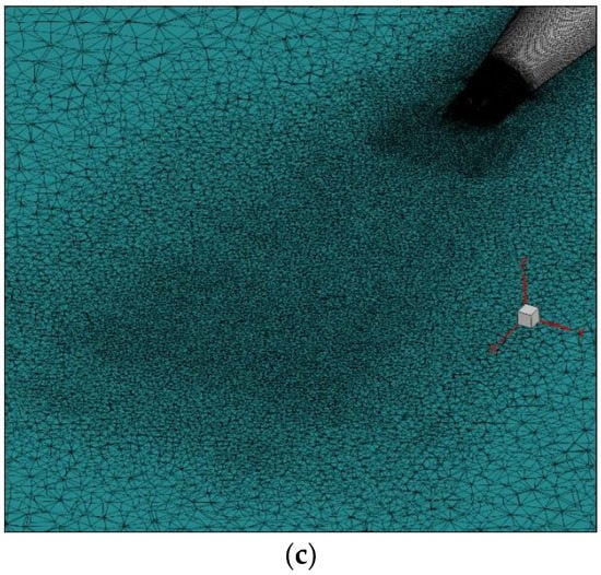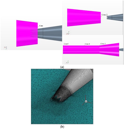 A steady state solution was obtained upon running a RANS simulation. Based on a mesh-refinement study focused on the center-line velocity distribution, it was observed that a mesh with 4 million cells provides grid-independent results for the half model. Therefore, for the full model, the domain was discretized using 8.5 million cells. The computational grid is controlled using volumetric zones when mesh size is specified, and the locations of these volumetric zones are shown in Figure 2a. The grid sizes specified are 1.75 mm, 2 mm, 3.75, and 5 mm in the cone, cone2, cone4, and cone5 regions, respectively. Moreover, the grid at the exit of the chevron nozzle was fine due to the “cone” volumetric region and grid size was gradually increased in the mid plane as shown in Figure 2b,c. Since the Ffowcs Williams–Hawkings noise model is used to predict the acoustic signature, an acoustic source surface must be determined. The Fourier transform of the pressure at the observer’s location is provided by the following relation. See Mendez et al. [].