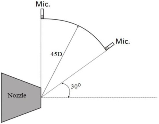 Detailed experimental studies pertaining to the acoustic characteristics of chevron nozzles were reported by Nikam and Sharma [,]. Their experiment compares the acoustic characteristics in the near field and the far field with those of the base nozzle at two different Mach numbers (0.5 and 0.8). It was found that the peak sound pressure level (SPL) in the near field shifts towards a low frequency, whereas in the far field, chevron shifts the peak SPL towards a high frequency. This is because pressure is a combination of hydrodynamic and acoustic components in the near field. Callender et al. [] have documented the acoustic benefits of chevron geometric parameters based on an experimental study.