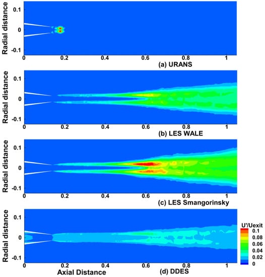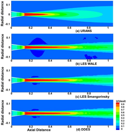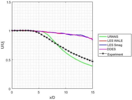 In Figure 5, the centerline velocity predictions of the various models are compared with the experimental data of the centerline velocity (non-dimensionalized with exit jet velocity, Uj). Figure 6 shows the predictions of different turbulent models compared with the experimental data of Sharma and Nikam []. While all models reproduce the experimental data in the near field, the LES and the DES models are found to over-predict the centerline velocity beyond x/D = 5.5. This inaccuracy can be attributed to the uncertainties in the inflow conditions, which poorly predict the initial shear layer (commonly one order of magnitude thicker than what is found experimentally). Since the resolution of the initial shear layer is strongly coupled with the centerline evolution of mean and fluctuating components of axial velocity, the potential core length prediction will be unreliable unless sufficiently thin initial shear layers are used. Bodony and Lele [] and Wang et al. [] have found that a lower-order code overpredicts the potential core length by 200% and the spreading rate by 15% for a round jet from a conventional nozzle.