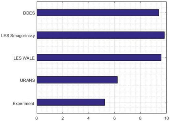 The k-ω model, which solves two additional equations for the turbulent kinetic energy (k) and the specific dissipation rate (ω), was used for the URANS modeling. The shear stress transport (SST) variant of the k-ω model, proposed by Menter [], was used in this study. In this approach, a zonal blending is applied for the clipping of turbulent viscosity so that turbulent stress is not overpredicted. In the LES approach, the instantaneous velocity field can be considered as having a resolved scale and a sub-grid scale. Eddies smaller than the grid size are removed and modeled by a subgrid scale (SGS) model. Larger eddies are directly solved numerically by the filtered transient NS equation. Details of the formulation of the models can be seen in [].