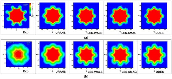 The velocity fields predicted by the various models are compared with the experimental images in Figure 7 at two radial planes in the near-field of the jet exit. Figure 7a shows the velocity contours at x/D = 0.5 and Figure 7b shows those at x/D = 2. It can be seen that at x/D = 0.5, the relatively sharper profiles of the shear layer, as predicted by the LES and the DDES models, depict the troughs and the crests of the chevrons closely resembling the experimental contours. At the downstream location (x/D = 2), the cross-section of the jet approaches that of an axisymmetric jet due to the intense mixing caused by the chevrons. Mixing causes the rapid decay of the azimuthal variations in the velocity field. While the gradients within the shear layer tend to get smeared in the URANS profile, the eddy simulation models are able to retain the shear layer structure more evidently (Figure 7b). Since the mixing enhancement is directly related to the acoustics, this observation is important from the perspective of prediction of the acoustics characteristics as well.
