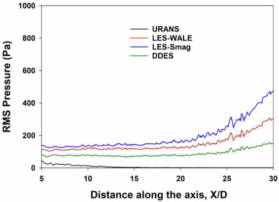 In Figure 10, the RMS pressure fluctuations are shown along the axis of the jet. Since sound is a small perturbation of pressure over a mean pressure, the root mean square value of static pressure is directly indicative of the intensity of the acoustic field. While the URANS approach does not model the fluctuations along the jet, the eddy simulation methods capture the fluctuations, and this contributes to the prediction of the sound level. Higher values of RMS pressure stem from significantly higher unsteadiness and an increased level of turbulence.