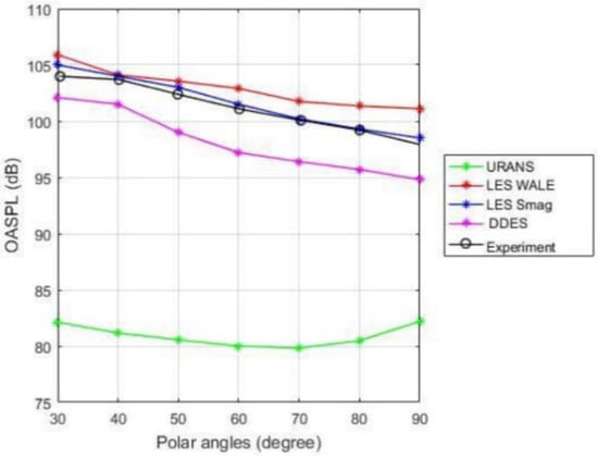 The increase in noise level at lower polar angles (say at 30°) in comparison to that at a polar angle of 90° can be noted in the experimental data. Sharma and Nikam [] attribute this to the directivity of the source. Both LES and DDES are able to capture this trend in the simulation.