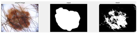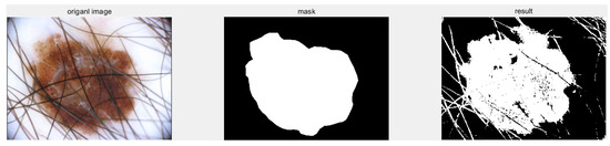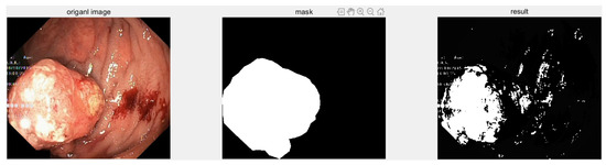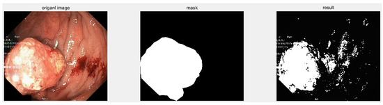 The performance of the genetic algorithm-based clustering and segmentation algorithm in the two datasets is shown in Table 1 and the schematic is presented in Figure 2. It can be seen that its accuracy in the Kvasir-SEG dataset is only 78.52%. Figure 3 and Figure 4 shows the segmentation result of one of the images. The left image is the original image to be segmented, the middle image is the manually segmented reference image, and the right image is the segmentation result. In the ISIC dataset, the accuracy rate is 86.89%. The segmentation results of one of them are also shown in Figure 4. Then, after converting the RGB images in the dataset to the HSI color model, image segmentation is performed. The performance on the two datasets is shown in Table 2. Here, the same images as the cluster segmentation algorithm are also selected for display (Figure 5 and Figure 6), and these are used to compare the differences.