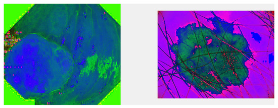 A picture of the HSI color model. Images converted (from two datasets) from RGB to HSI. The left image is the conversion result of the image displayed in the Kavsir-SEG dataset, and the right image is the conversion result of the image displayed in the ISIC dataset.