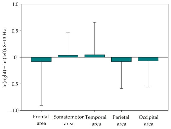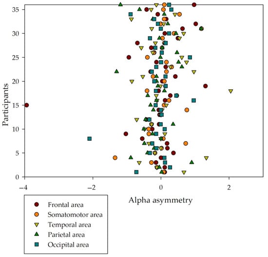 Mean (SD) asymmetry in the analyzed areas was negative in frontal [−0.0822 (0.822)], temporal [−0.0826 (0.504)] and occipital [−0.0826 (0.504)] areas, indicating a greater alpha power in the left hemisphere that would correspond with a greater activity in the right hemisphere of these areas. Asymmetry was found positive in somatomotor [0.0383 (0.422)] and temporal [0.0474 (0.610)] areas indicating a greater alpha power in the right hemisphere and greater activity in the left one (see Table 3). The high deviations indicate a high variability among subjects (Figure 1).