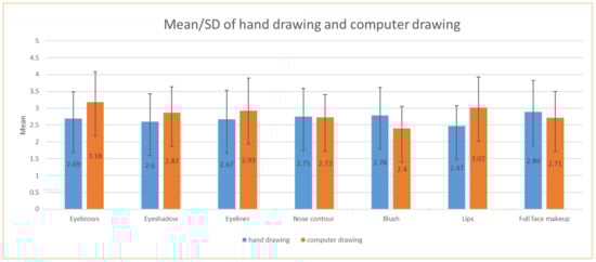 First, a reliability analysis of the hand-drawn work evaluation rubric was carried out to evaluate the reliability statistics of the questionnaire. The Cronbach’s α value was 0.679, indicating the internal consistency of the overall scale was acceptable. The effective observation value was 55, and there were seven items in the questionnaire (Table 7). The mean of each item was expected to tend to the middle value; items with excessively high or low means would indicate low discrimination or obvious bias and need to be deleted. As shown in Table 7, the mean was 2.66 for the whole scale and all the mean values were between 1.48–3.84, SD > 0.7, except for lips = 0.604 < 0.7. The descriptive statistical results showed the mean and SD of the parts with the top three high scores in hand-drawn makeup design were: blush (mean = 2.78, SD = 0.832); nose contour (mean = 2.75, SD = 0.844); and full face (mean = 2.75, SD = 0.775). Next, the reliability analysis of works that were done by the computer graphic evaluation rubric was carried out to evaluate the reliability statistics of the questionnaire. The Cronbach’s α value of the questionnaire was 0.766, indicating the internal consistency of the overall scale was good. There were 55 valid observation values and seven items in the questionnaire. According to Table 8 (the descriptive statistics rating for computer graphic works rubric), the mean was 2.834 for the whole scale, indicating the computer graphic works received higher scores. Moreover, the average scores of the top three items are: eyebrows (mean = 3.18, SD = 0.905); lips (mean = 3.02, SD = 0.913); and eyeliner (mean = 2.93, SD = 0.959). According to the above results, it could be found that in terms of the dyeing effect of the makeup design drawing, the computer graphic design was poor, while in terms of symmetry, it had great advantages. Each mean was between 1.619 and 4.049, SD > 0.7 (nose contour = 0.679 < 0.7; blush = 0.655 < 0.7), and the absolute value of bias was less than 0.7 (blush = 1.409 > 0.7; full face makeup = 0.810 > 0.7). Therefore, blush showed an obvious bias in computer graphic design. Among the items, the mean for computer graphic drawing eyebrows was 3.18, which was the highest score in the questionnaire. The mean value/SD of hand drawing and computer drawing is shown in Figure 3. During the focus interviews, the subjects liked drawing eyebrows using computer graphic design the most. With the help of the mirror tool, their drawings could be completed quickly, their works were balanced and beautiful, and the students had a sense of achievement. Therefore, the results of computer graphic design learning were fully reflected in the results of the final works. Computer graphic drawing lips, with a mean of 3.02, had the second highest score in the questionnaire. Painter drawing eyeliner, with a mean of 2.93, had the third highest score in the questionnaire. The lowest score in the questionnaire was computer graphic drawing blush, with a mean of 2.40, and this item had an obvious bias. The experts pointed out that when drawing with a computer, heavy strokes affect the presentation of uniform naturalness. The students understood how to use hand drawing as a tool, and it had the advantage of controlling the force when dyeing. Therefore, hand drawing blush, with a mean of 2.78, was greater than computer graphic drawing blush, with a mean of 2.40, while hand drawing nose contour, with a mean of 2.75, was greater than computer drawing nose contour, with a mean of 2.73.