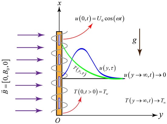 In the above-mentioned equations, u denotes the x-component of the velocity vector, T indicates the fluid temperature, and represents the dimensional time. Further, U0 is the velocity amplitude of the plate oscillations, denotes the ambient temperature, Tw is the wall temperature, Cp shows the specific heat of the fluid at constant pressure, ω represents the frequency of the oscillating plate, ρ is the fluid density, µ is the dynamic viscosity of the Newtonian fluid, υ shows kinematic viscosity, σ indicates the electrical conductivity of the fluid, g shows gravitational acceleration, B0 shows the uniform magnetic field strength, β0 and β1 are thermal expansion coefficients, and k is the thermal conductivity of the working fluid.