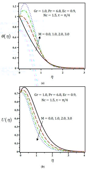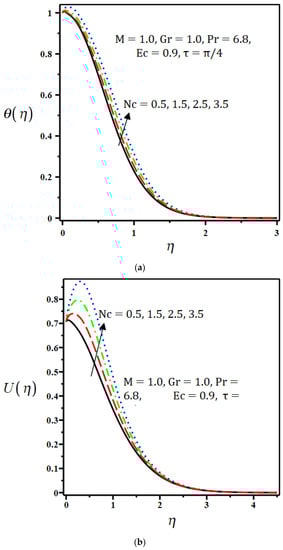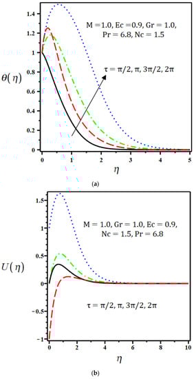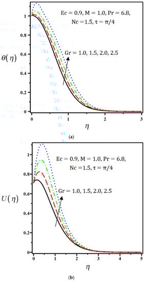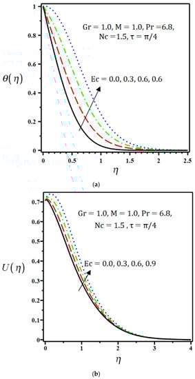 The Eckert number’s influence on temperature along with velocity can be observed, respectively, in Figure 2a,b. Fluid accelerates with the enhancing Eckert number. True to form, the thermal boundary layer shows increments with . This is on the grounds that by increasing the Eckert number, the fluid contact between the contiguous layers increments and the friction between the layers of fluid increases, thus transforming kinetic into heat energy (in this manner, increasing the temperature of the fluid). Figure 3a,b shows the impact of the Grashof number on temperature and velocity profiles. Velocity as well as temperature increase with growing . This is because as the Grashof number increases, the buoyancy force also increases, which accelerates the fluid, subsequently increasing its temperature. Figure 4a,b illustrate how the magnetic parameter influences temperature and velocity. Here, the temperature rises as the magnetic parameter increases whereas the velocity profile of fluid diminishes. From Figure 4b, it is presumed that the Lorentz force produced opposes the fluid flow. Because of the resulting deceleration, the impact of viscosity increases, which produces frictional heating, thus increasing the temperature. In Figure 5a,b, the impact of the non-linear convection parameter is shown on the temperature and velocity of the fluid. It is obvious (by graphical representation) that both the temperature and velocity profiles show increments with the increase in . This is valid because by increasing , the heat dissipation of the fluid surface enhances due to more diffusion, therefore showing increments in the temperature and velocity of the fluid. Figure 6a,b represents the impact of the Prandtl number on temperature and velocity. Here, the temperature as well as the velocity decline with the increment in . By increasing the Prandtl number, there is a decrement in thermal conductivity, which slows down the heat transfer rate and, consequently, reduces the temperature. The impact of time on the temperature and velocity is outlined in Figure 7a,b. It was observed that there is an increase in the thermal boundary layer with the preceding time, thus resulting in an increased temperature.
