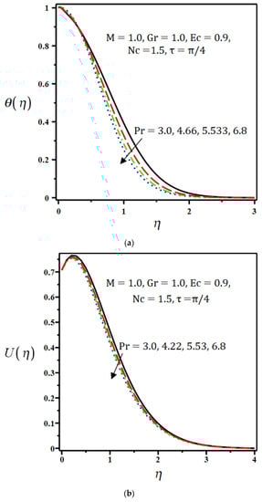 - The velocity field diminishes with the increase in the magnetic parameter and Prandtl number.