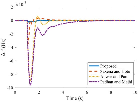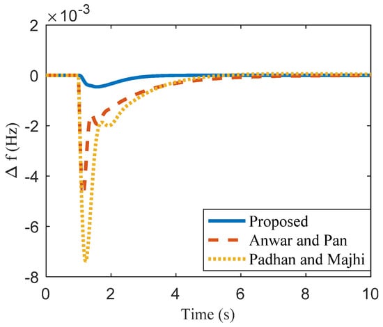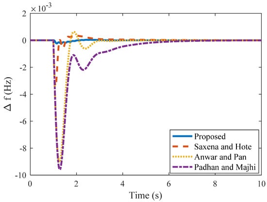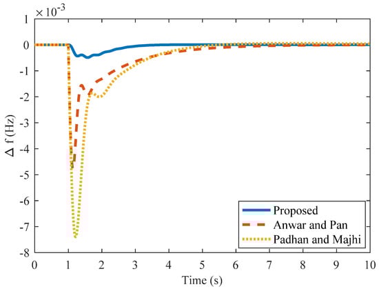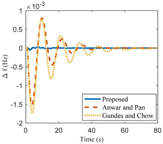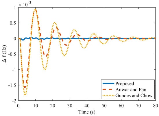 The desired IMC filter and desired load-disturbance transfer function (LDTF) model is considered with L1 = 0.3, r1 = 3, and L2 = 0.3, n2 = 3, respectively. The proposed controller via the 2DoF-IMC technique is derived as Kc(s) = 16.0328 + 4.7448 s. The obtained controller performance is observed with a unit step load (i.e., ΔPd = 0.01 p.u.) at t = 1 s in a SAPS. Figure 7 shows the frequency regulation response of the nominal system in case 2 and confirms that the proposed method has a smaller percent undershoot as well as faster transient frequency response compared against Padhan and Majhi [] and Anwar and Pan []. Figure 8 shows that the frequency regulation of the perturbed system (50% increment in Kp and Tp gain) is approximately the same as the nominal system and shows that the proposed controller via the 2DoF-IMC technique provides a better frequency response against Padhan and Majhi [] and Anwar and Pan []. The comparative analysis of the nominal along with the perturbed system is provided in Table 2. The proposed method has a superior settling time (ts), integral of square error (ISE), and smaller percent undershoot (%US) for the nominal model and perturbation in the nominal model is provided in Table 2. Frequency regulation in Figure 8 illustrates that the proposed controller utilizing 2DoF-IMC is more robust against the latest reported method.