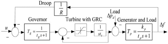 The third-order model of a single-area thermal power system consisting of a governor, turbine, generator, and load is shown in Figure 3. The simplified transfer function of the nominal model from Figure 3 is written as