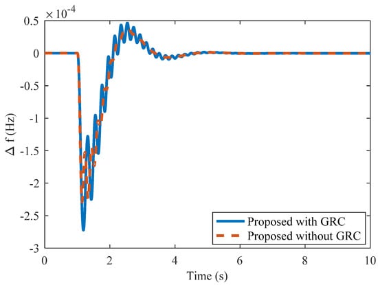 In this case, the parameter of GRC is taken as 0.1 p.u./min = 0.0017 p.u./s []. The desired IMC filter and load-disturbance transfer function model are considered with L1 = 0.1, r1 = 3, and L2 = 0.1, n2 = 3, respectively. The proposed controller via the 2DoF-IMC technique is derived as Kc(s) = 44.72 + 4.1668 s. The frequency regulation of the LFC system with GRC is performed satisfactorily, which is shown in Figure 12. The proposed controller via the 2DoF-IMC technique outperforms with consideration of the GRC effect.