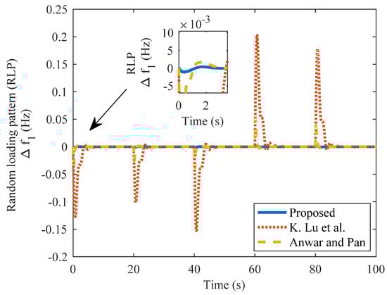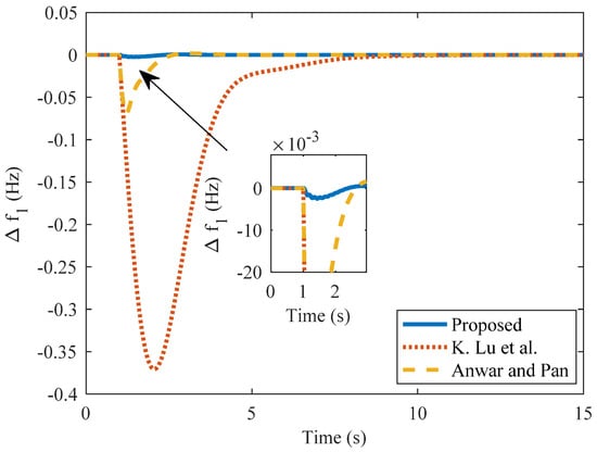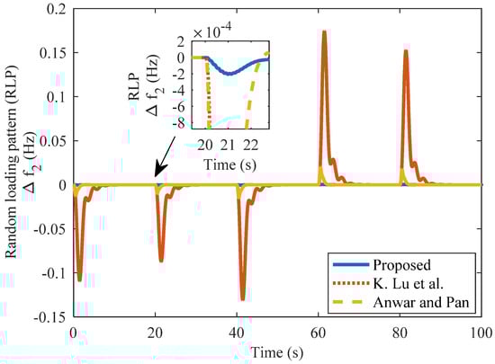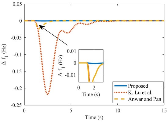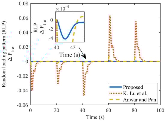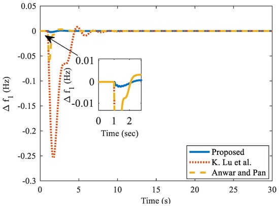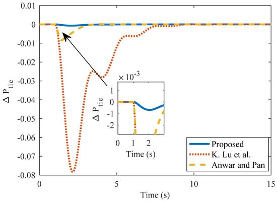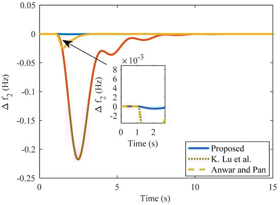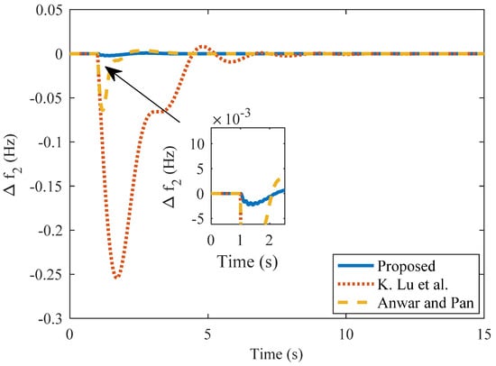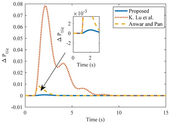 In case 5c, the 10% step load was considered in area 1 and area 2 to illustrate the dynamic performance of the TAPS. The system parameters are provided in A4 in Appendix A. In case 5c, the deviations in frequency of area 1 and area 2 are the same. Figure 19 shows that the proposed controller via the 2DoF-IMC technique has a smoother and better response than Anwar and Pan [] and K. Lu et al. [].