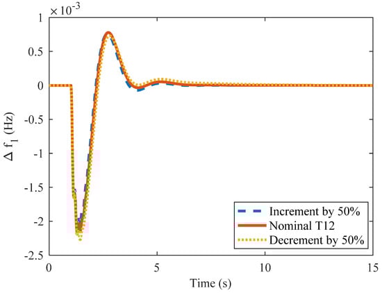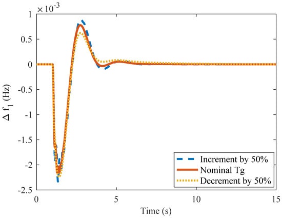 To validate the robustness of the proposed controller via the 2DoF-IMC technique the time constant of the generator Tg was varied. In case 5d, ±50% changes in Tg were considered and from Figure 20 it was observed that frequency deviation is the same as the nominal model in the perturbed system. Therefore, we can easily conclude that the proposed controller utilizing the 2DoF-IMC technique is more robust.